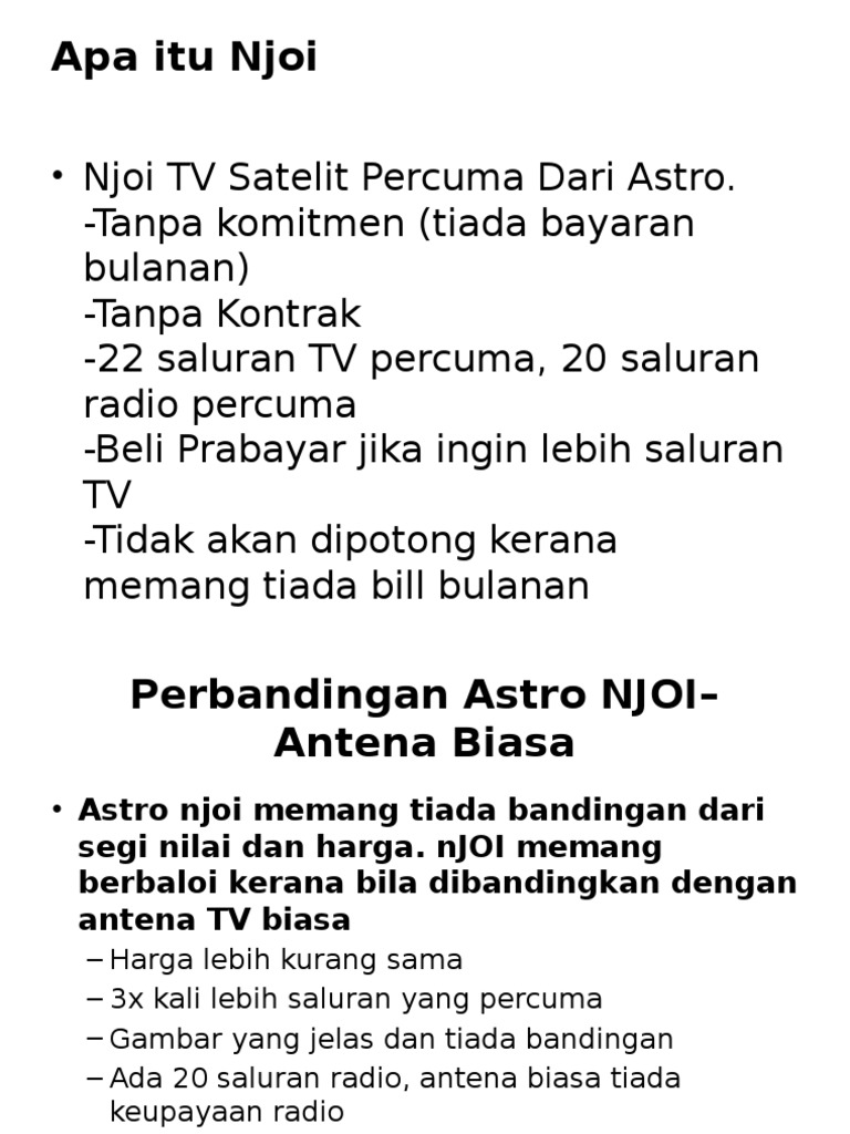 Apa itu astro njoi. Sekiranya ya saluran tv yang terhad ini mungkin membosankan andatetapi anda juga boleh melanggan saluran tv Astro. Yang pakai plasma tv ok lagi kualiti gambar masih. Jan 11 2016 824 PTG dvb mytv tips Tiada ulasan Untuk pelanggan TV Berbayar Jika anda adalah pelanggan TV berbayar seperti ASTRO NJOI atau HyppTV anda tidak perlu berbuat apa-apa kerana anda sudah menonton saluran TV dalam transmisi digital melalui perkhidmatan TV berbayar anda.